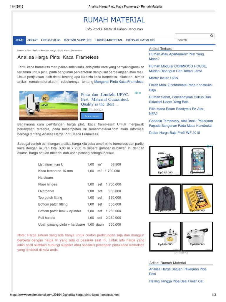 Harga satuan yang ada hanya untuk contoh perhitungan saja dan mungkin berbeda dengan harga riil yang ada di pasaran saat ini. Harga pintu kaca frameless biasanya memakai kaca tempered bening dengan tebal 12 mm. Pintu frameless biasanya merupakan dengan pintu kaca tebal, terbuat dari kaca tebal 10mm dan 12 mm. Set pintu sliding kaca frameless glass sliding door track accessory: 1 unit daun pintu kaca tempered 12mm.